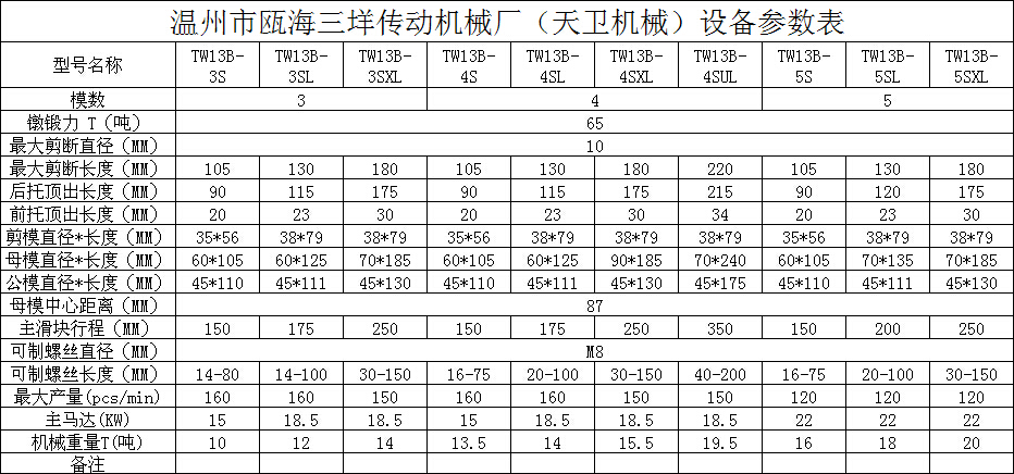 您當(dāng)前的位置:首頁(yè) / 產(chǎn)品中心 / 四模四沖冷鐓機(jī) / └ TW13B(M8)全自動(dòng)多工位冷鐓機(jī) / TW13B四模四沖多工位冷鐓機(jī)